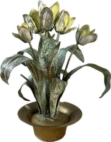 1960s Vintage Florentia Italian tole yellow tulips in gold base. Original Florentia lable on base bottom. Patina & imperfections throughout item is in line with the age.